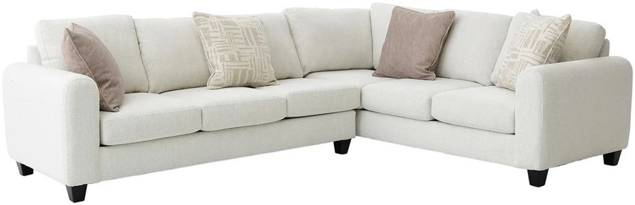 Upholstered in a cream woven fabric with light gray undertones, this sectional features plump back and seat cushions, padded arms, two coordinating toss pillows, two contrasting toss pillows, tailored base, and tapered block feet in an espresso finish.Read More