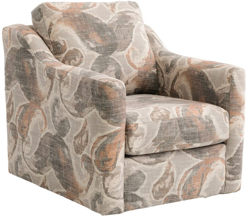 Upholstered in a patterned gray, brown, black, orange, and cream woven fabric, this swivel chair features a reversible back and seat cushion, padded track arms, tailored base, with a 360-degree swivel base.Read More