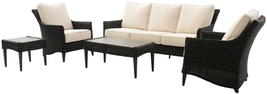 This lounge patio set includes a sofa, two chairs, a coffee table, and an end table that have dark brown powder coated aluminum frames with brown all-weather wicker. The sofa and chairs feature plump cushions upholstered in a cream SPF-protected fabric, tapered arms, tailored base, and tapered feet in a dark brown finish.Read More
