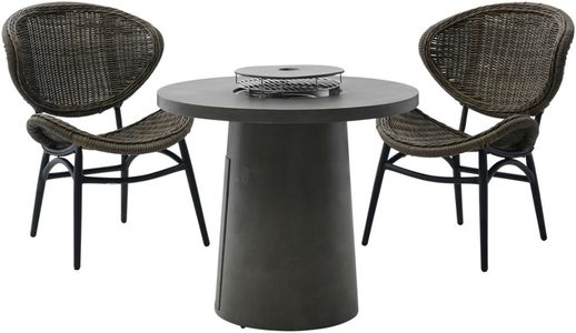 This lounge patio set includes two chairs and a firepit that have black powder coated aluminum frames. The chairs feature a tan and dark brown all-weather wicker curved back and seat. The firepit features a split level top that reveals a burner at the center and a pull-out door on the pedestal base to place a propane tank.Read More
