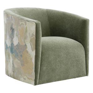 Upholstered in a sage green velour fabric with the back and sides of this chair showcasing a sage green, cream, taupe, tan, blue, and gray abstract-design velour fabric, this swivel chair features a padded barrel back, plump seat cushion, tailored base, with a 360-degree swivel base.Read More