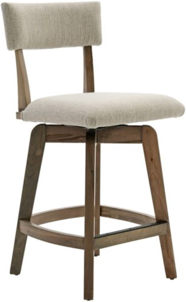 This counter stool features a padded back rest and 180-degree swivel seat upholstered in a beige woven fabric with tan, dark brown, and medallion yellow undertones, with a wooden frame crafted of wormy maple with a light gray rub-through Belair finish.Read More