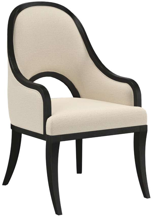 Exposed wood arm chair in blackened sable finish and contrasting beige fabric is as stately as it is comfortable, the hoop is repeated in an open arched space in the back for added elegance.Read More