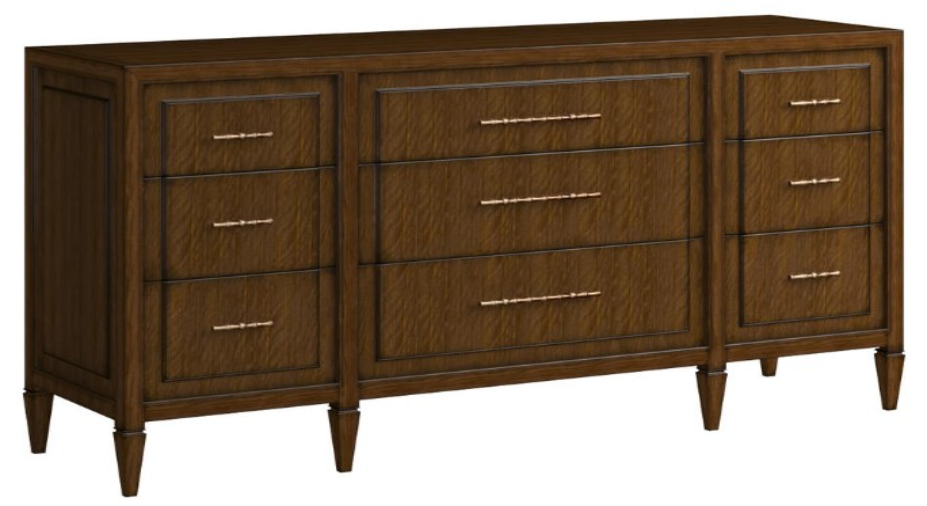New traditional break front dresser in quartered qalnut with faux bamboo hardware in burnished gold finish. A reinvention of 19th-Century English classics infused with Chinoiserie details. Collections features pieces finished in stunning clear quartered walnut veneer, mixed with selected items in Candy Apple Red, Black and Frosted Bronze bridging timeless elegance with modern sofphistication.Read More