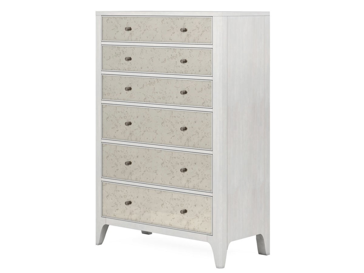 Crafted of poplar and parawood solids with maple veneers in a dove gray finish, this chest features a handsome top, six drawers with antiqued mirror drawer fronts (bottom two drawers are cedar lined), brushed nickel finished hardware, and tapered feet.Read More