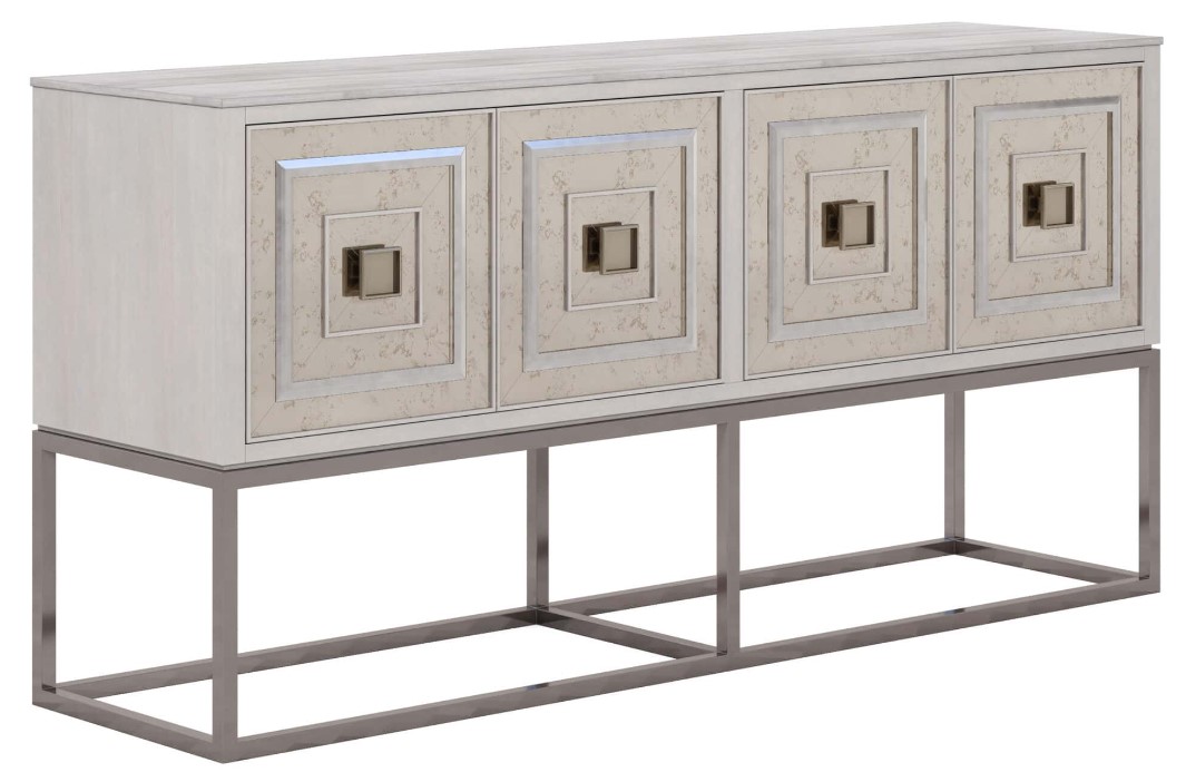 Material(s): Parawood and poplar solids, maple veneer, mirror, travertine, steel