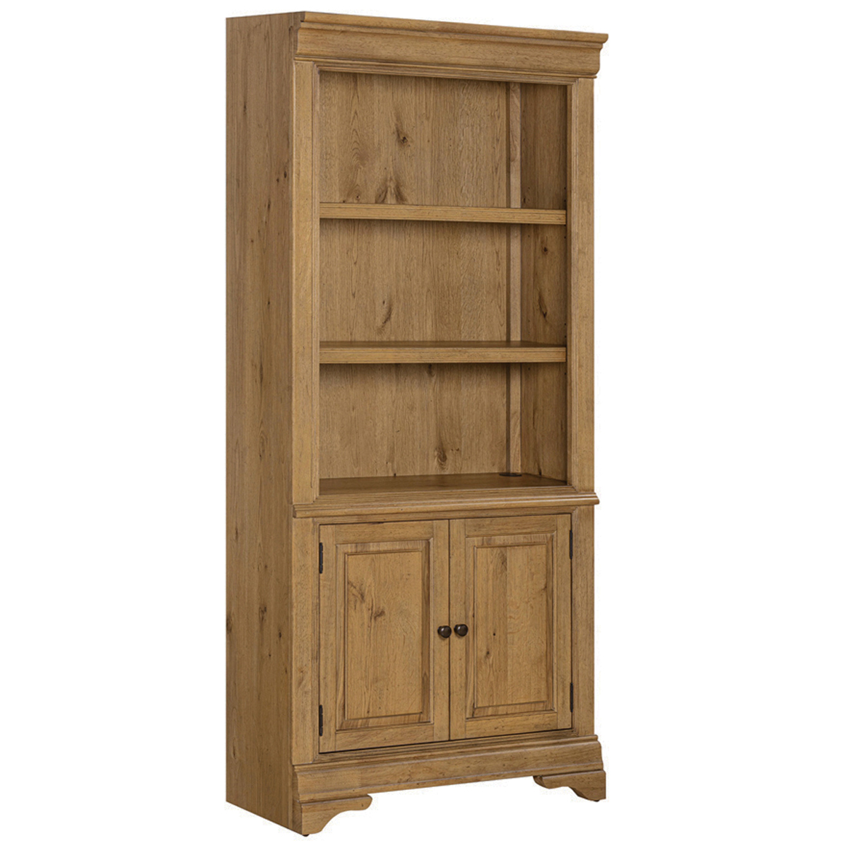 Crafted with select hardwood solids and white oak veneers in a natural oak finish, this bookcase features three adjustable shelves, two doors, bronze finished metal door knobs, cord management, crown molding details, and bracket feet.Read More