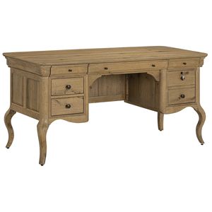 Crafted with select hardwood solids and white oak veneers in a natural oak finish, this desk features a drop-front keyboard drawer, four drawers with removable dividers, a locking file cabinet drawer, a power pack, cord management, brass finished metal hardware, and cabriole legs.Read More