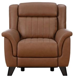 Mid-century modern elevated recliner. Featuring power recline pad over chaise channeled box seating, split channeled pub back with power head rest and tucked plush pillow arms. Outside arm power controller with USB port. Merlot finish wood legs.Read More