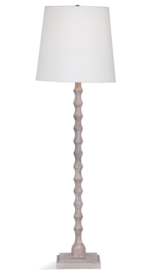 The Bobbin Buffet Lamp features a turned base with an off white tapered shade. Finish: white wash. The hand crafted details produced by a skilled artist lends itself to a unique technique and will vary slightly.Read More