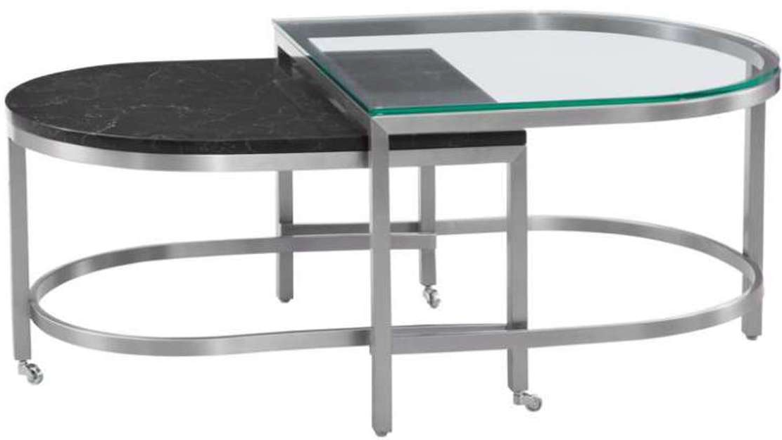 The taller table is adorned with a clear, tempered glass top, while the nesting table showcases a beautiful black marble top. With added casters for easy movement, the Hensley Cocktail Table combines both elegance and practicality, making it a fine addition to your home decor.