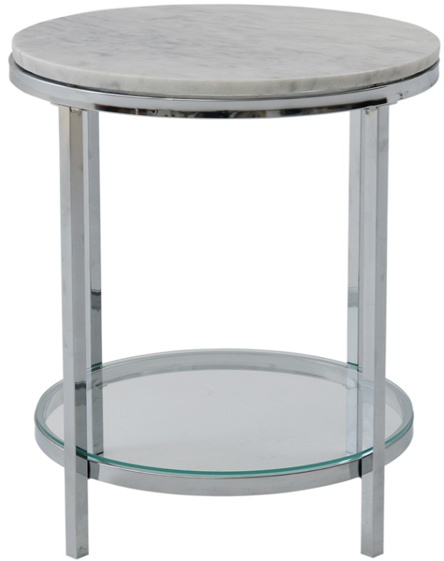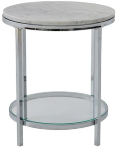 With a metal base in a nickel finish, this round end table has a light gray stone top with black veining and a glass lower shelf. Its sturdy construction offers a convenient surface for lamps, décor, or everyday essentials beside sofas or chairs.Read More