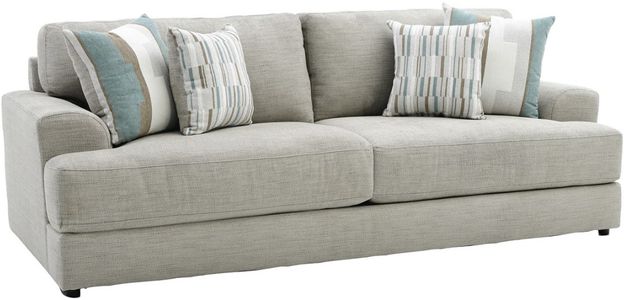 Upholstered in a dove gray woven fabric with taupe, cream, and black undertones, this sofa features reversible back and seat cushions, padded tapered arms, four coordinating toss pillows, and a tailored base.Read More