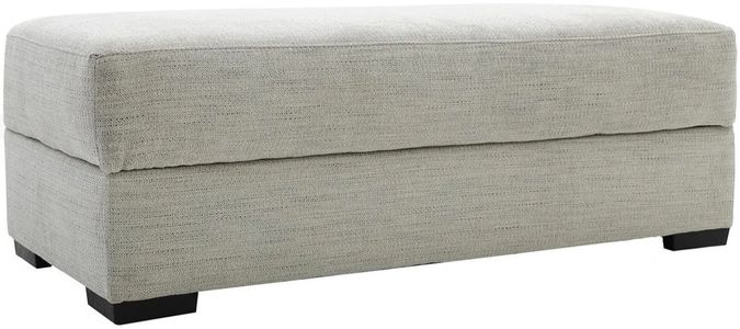 Upholstered in a dove gray woven fabric with taupe and cream undertones, this storage ottoman features a plump cushion, hidden storage on the inside, tailored base, block feet in a dark brown finish, with hidden casters on the bottom for easy movement.Read More