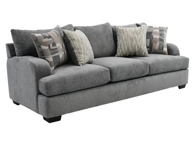Upholstered in a gray velour fabric with light gray and black undertones, this sofa features reversible back and seat cushions, padded track arms, four coordinating toss pillows, tailored base, and tapered block feet in a black finish.Read More