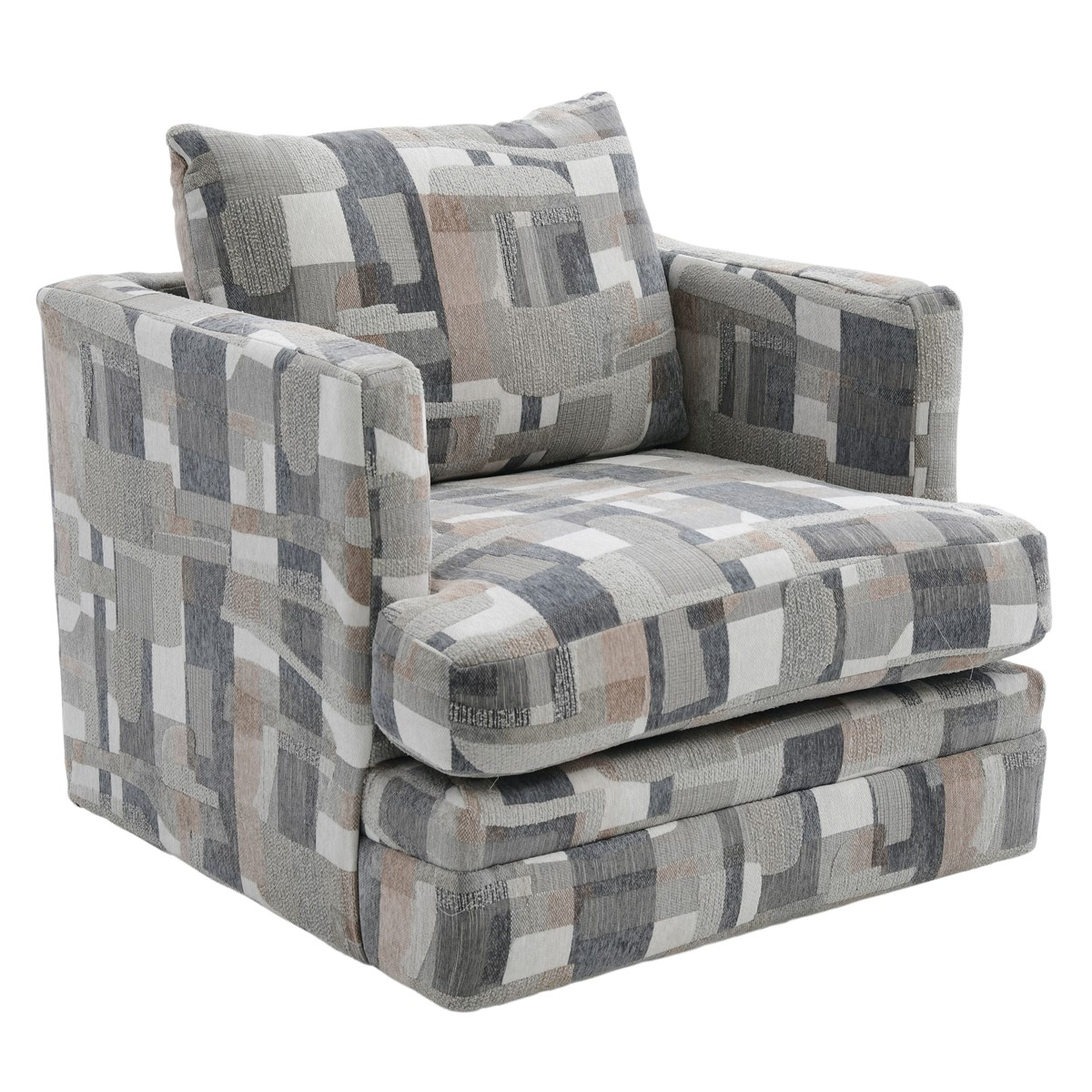 Upholstered in a patterned cream woven fabric with gray, beige, brown, and dark gray undertones, this swivel chair features a reversible back and seat cushion, padded track arms, tailored base, with a 360-degree swivel base.Read More
