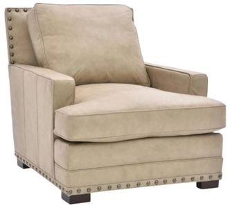 Covered in a supple, two tone sauvage beige-colored top-grain leather, this chair features plump spring down seat cushion, tall back cushion, padded arms, antique nickel nailhead trim, and modern block feet.Read More