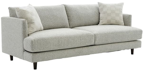 Upholstered in a cream woven fabric with gray and taupe undertones, this sofa features reversible back and seat cushions, padded tapered arms, two coordinating toss pillows, a tailored base, and wooden tapered legs in a dark brown finish.Read More