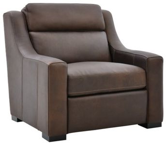 Upholstered in a dark brown top-grain leather, this chair features a power reclining headrest and footrest, plump seat cushion, padded track arms, a USB port, a tailored base, and block feet in an espresso finish.Read More