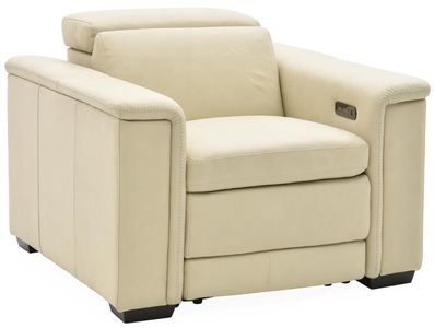 The Bernhardt Lioni power recliner is covered in a linen-colored smooth top-grain leather. The recliner features wall-hugging design and button controls for the power headrest and footrest. This luxurious recliner also features fine stitch detailing, padded track arms, as well as block feet in a black finish.Read More