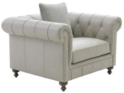 Upholstered in an off-white top-grain leather, this chair features a padded back and rolled arms with button-tufting, premium down seat cushion, a coordinating toss pillow, nickel finished nailhead trim, tailored base with button-tufting, and bun feet in a hazelnut finish.Read More