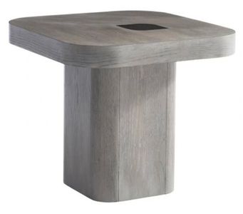 Sleek modern lines and a unique metal inlay offer a distinctive style for the Marcato side table. A pedestal supports a square top with rounded corners, with the table finished in Cerused Greige.Read More
