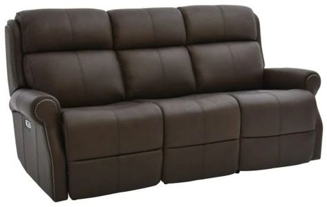 Upholstered in a chocolate brown top-grain leather, this sofa features power reclining headrests and chaise footrests, padded rolled arms, two USB ports, nickel finished nailheads, and stitched accents.Read More