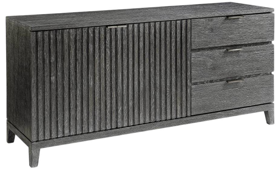 A modern perspective is redefined in a moody palette for the Menton buffet. Perfectly balancing beauty and function, the design offers two deeply reeded doors and three pull-to-open drawers with cast aluminum pulls. Interior storage includes two adjustable shelves.Read More