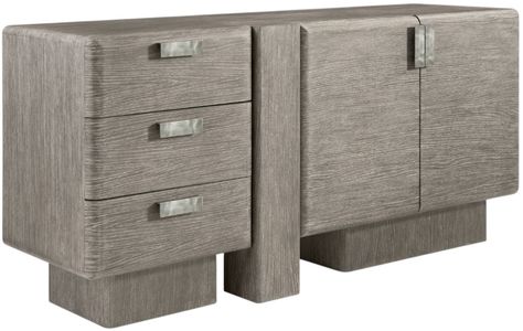 The Monolith buffet has a distinctive modern style with an offset vertical post between two sections set on plinths. On the left are three soft-close drawers with cast aluminum tab pulls in Graphite finish. On the right are two pull-to-open doors concealing adjustable shelves. The overall design is deeply textured in white oak in Puma finish.Read More