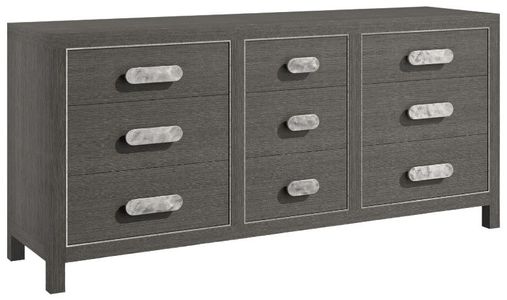 The deep porcini finish on the Prado dresser is balanced with the gleam of metal details. Nine drawers offer ample storage, with the center three in a smaller shape. Each of the three drawer boxes is outlined with inset metal frames in bright graphite finish.Read More