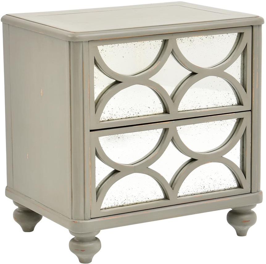 Crafted of select hardwood solids in an antiqued gray painted finish, this nightstand features two push-open drawers with an antiqued mirror front and lattice inset, and decorative feet. It includes spacious storage drawers for keeping essentials organized.Read More
