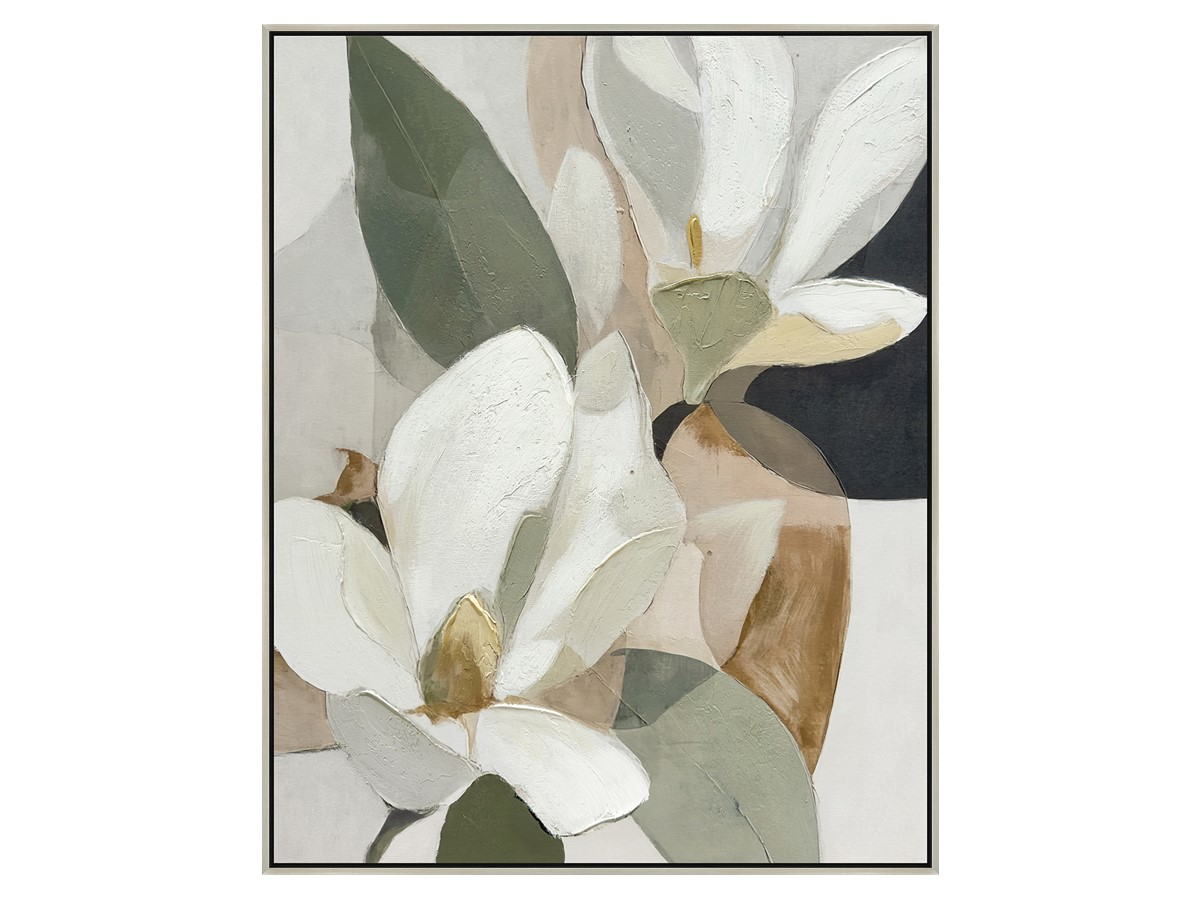This artwork features large-scale magnolia blooms with bold brushstrokes in warm white, cream, and muted tan petals, set against a soft background of layered greens, olive, taupe, and charcoal. It has a champagne-finished metal frame.Read More