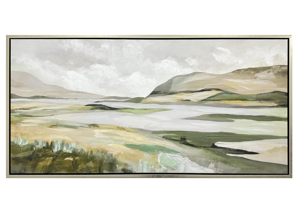 This artwork depicts a serene landscape with abstract hills and waterways in soft tones of sage green, beige, cream, and muted gold. It has a light gold-finished metal frame.Read More