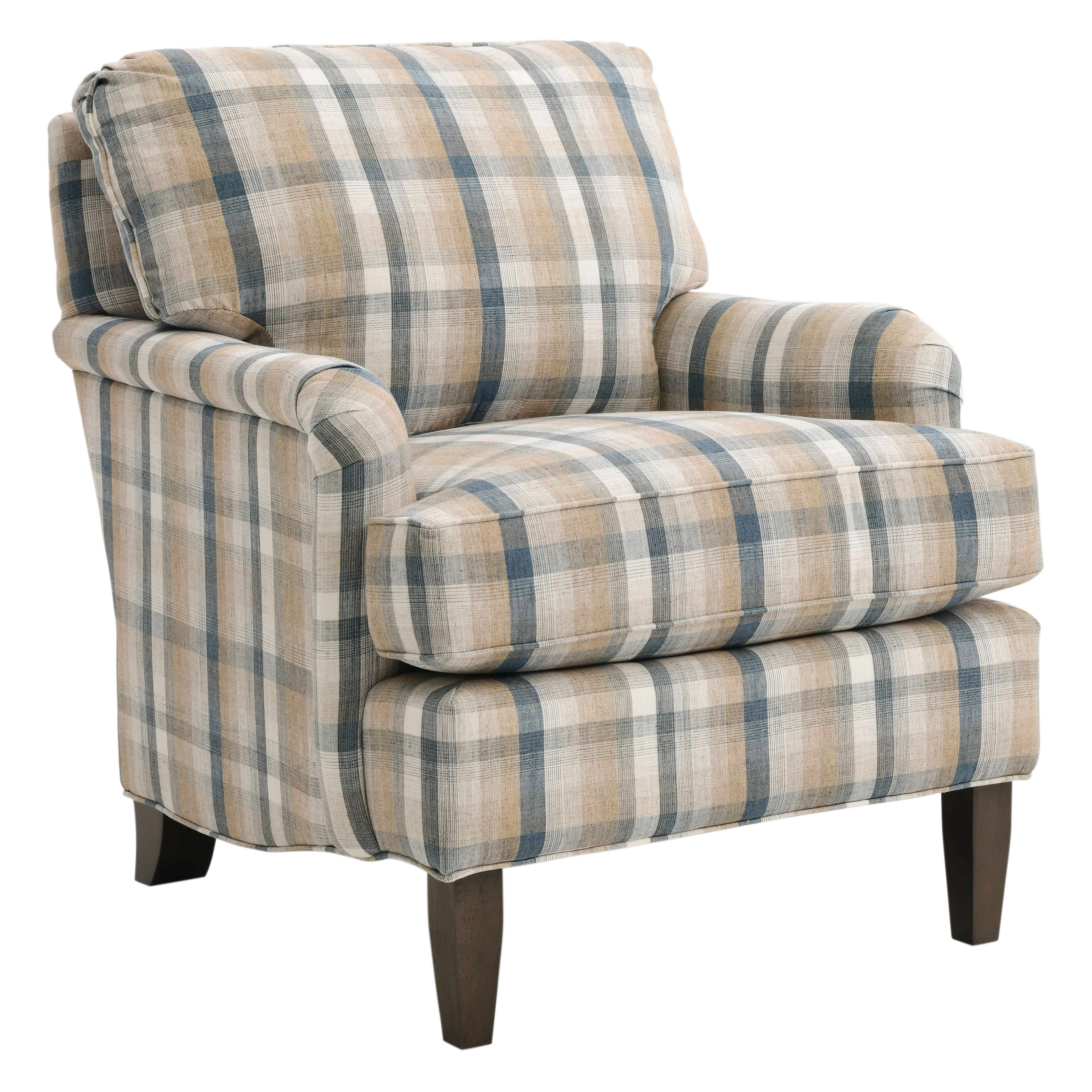 Upholstered in a plaid greige, taupe, and blue woven fabric, this accent chair features a plump back cushion, reversible seat cushion, padded arms, tailored base, and tapered feet in a dark brown finish.Read More