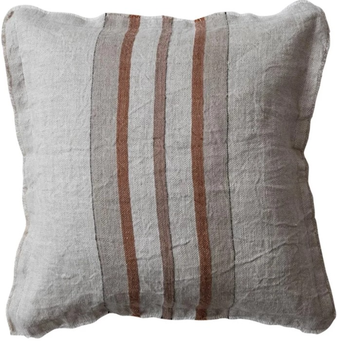 This decorative pillow is covered in light gray fabric featuring stripes in dark gray, tawny, brown, and black, accented with fringed edges. It adds texture, pattern, and style, making it a versatile accent for any space.Read More