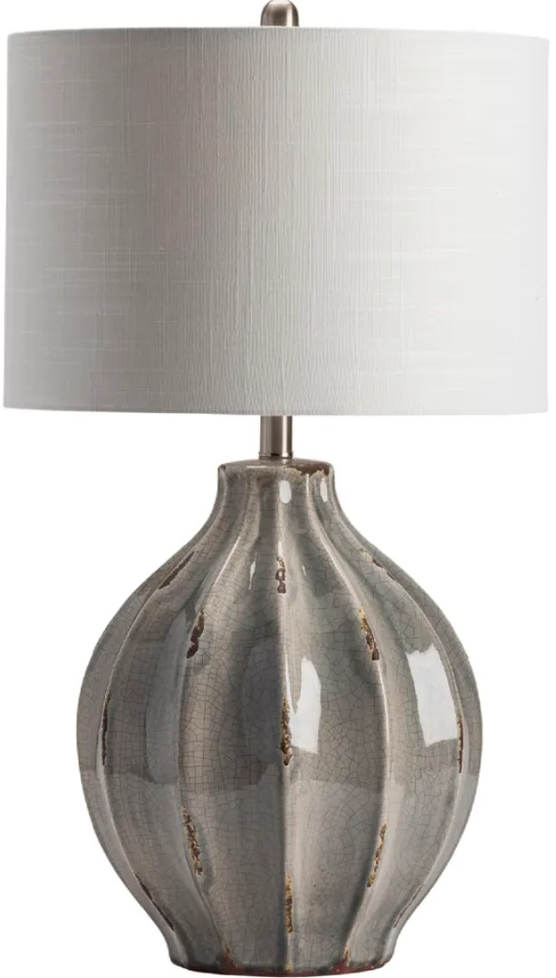 The Crestview Collection Perry Table Lamp features a soft gray, crackled finish with distressed marks. The ceramic body has scalloped ridges that give it a unique design. Silver hardware and a crisp, white drum shade add to the simple yet elegant design of this traditional lamp.Read More