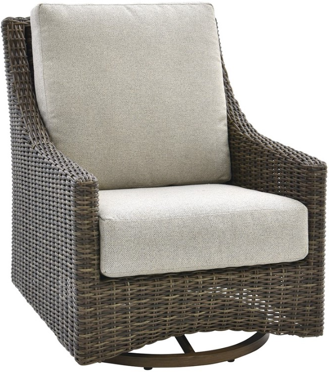 Crafted of all-weather wicker in a hickory finish, this club swivel chair features plump reversible cushions in a taupe and gray crosshatch Sunbrella outdoor fabric, tailored base, and a 360-degree swivel and gliding base.Read More