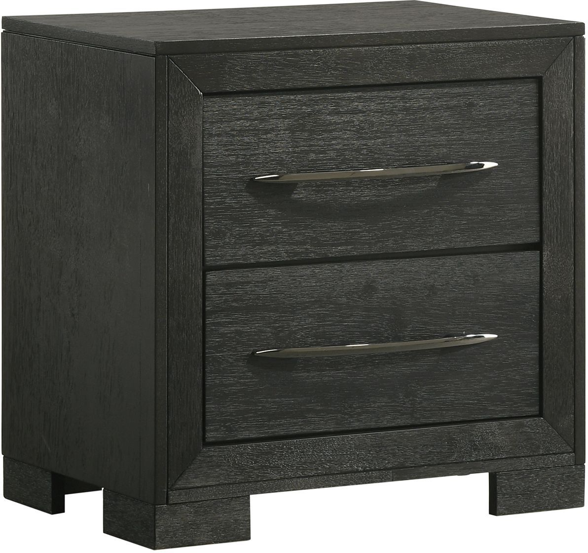 The platform style bed boasts an arched base and a panel headboard, adding visual interest to the room. The nightstand, chest of drawers, and dresser included in this set are beautifully accented by chrome finished hardware, adding a touch of modernity to the collection. Bring elegance and functionality to your bedroom with the Allan Black Bedroom collection.