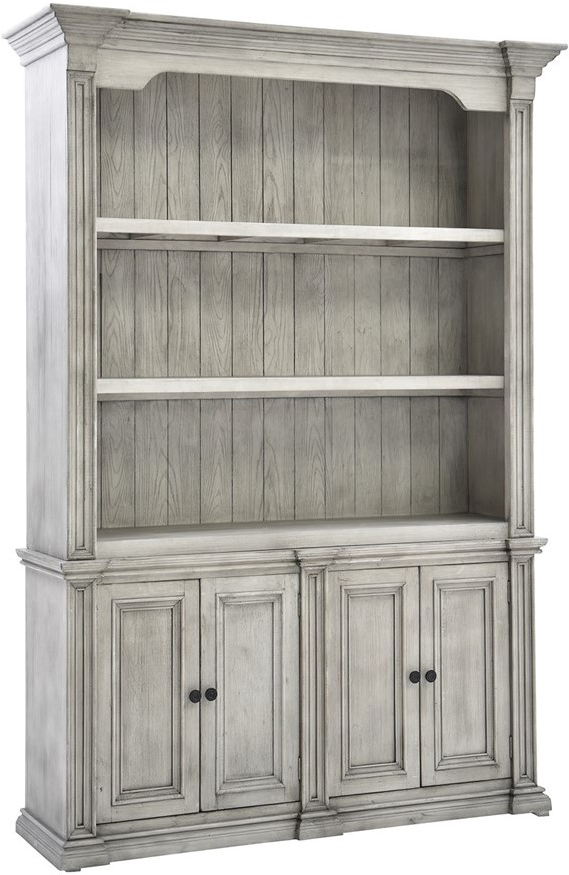 Crafted with select hardwood solids and veneers in a distressed oyster gray finish, this wall unit features two removable open shelves, two removable interior shelves, planked-styled backing, crown molding, black finished metal knobs, and a plinth base.Read More