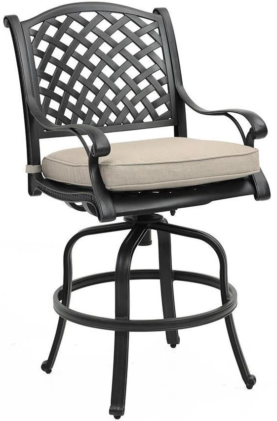 Style and function combine in this cast aluminum swivel counter stool in a midnight brown finish with a lattice back, seat cushion in a sand-colored SPF-20 (Solar Protected Fabric™) and 360-degree swivel.Read More