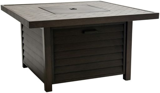 Crafted of aluminum in a dark brown finish made to look like wood, this fire pit features a dark taupe herringbone-patterned top, a removable lid that covers the burner, a pull-out door with a sliding mechanism to place a propane tank, a louvered-styled base, and block feet.Read More