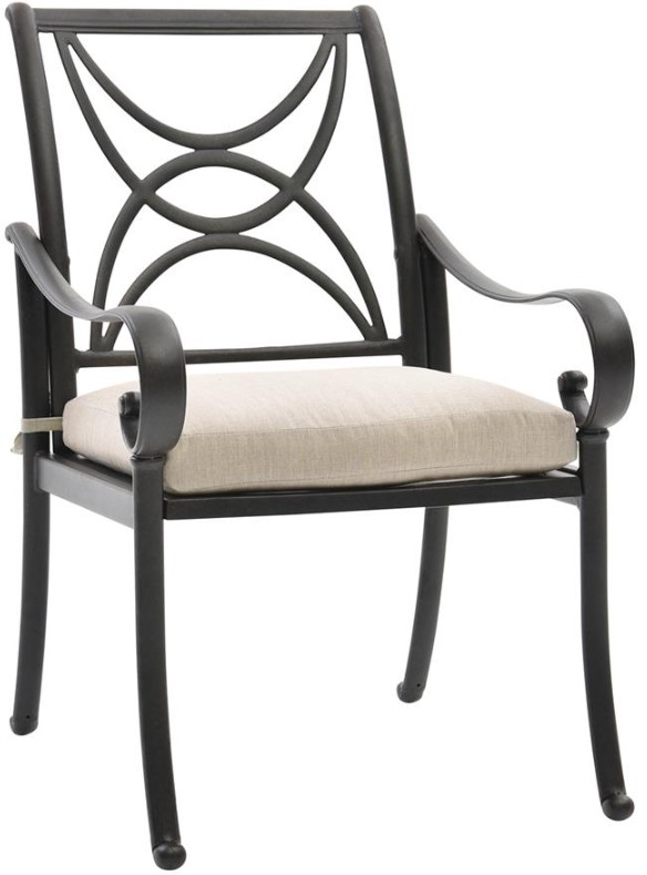 The Santa Barbara dining chair features lightweight, yet durable aluminum frame with 8-step powder-coated finish in desert bronze, scrolled arms, decorative back, snail feet, and a versatile weather resistant cushion in a cast ash color.Read More