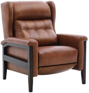Upholstered in a russet brown top-grain leather, this recliner features a padded bustle-back with button-tufting and channeling details, padded key arms, a plump seat cushion, stitched accents, and a wooden frame in a dark brown finish.Read More