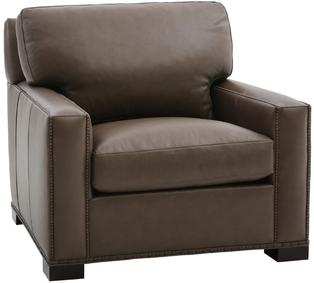 Upholstered in a truffle brown top-grain leather, this chair features a plump back and seat cushion, padded track arms, bronze finished nailhead trim, stitched accents, tailored base, and block feet in a dark brown finish.Read More