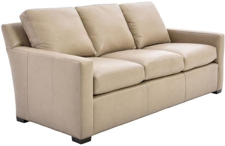 Upholstered in a taupe top-grain leather, this sofa features premium eight-way hand tied construction, plump back and seat cushions, padded track arms, stitched accents, tailored base, and slightly tapered block feet in an espresso finish.Read More