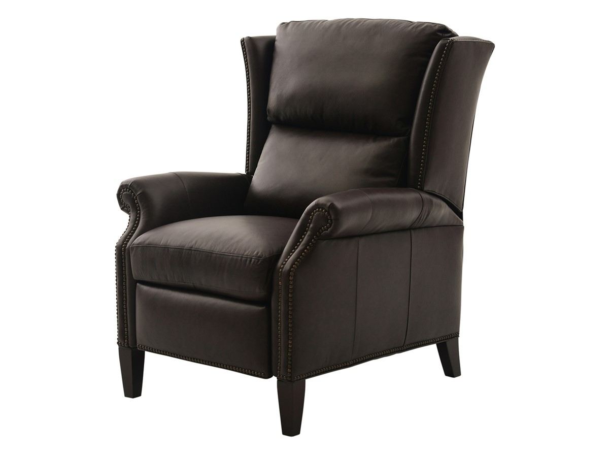 Upholstered in a dark brown top-grain leather, this recliner features a padded bustle back, a plump seat cushion, padded rolled arms, welt accents, bronze finished nailhead trim, and tapered feet in a dark brown finish.Read More