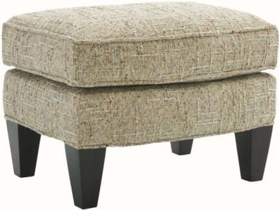 Upholstered in a tan woven fabric with ginger, cream, dark gray, and black undertones, this bowed ottoman features a plump cushion, tailored base, and tapered feet in a dark brown finish.Read More