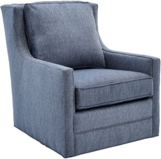 Upholstered in a denim blue geometric patterned fabric with tan and cream undertones, this swivel glider chair features a reversible back and seat cushion, padded track arms, and a 360-degree swivel gliding base.Read More