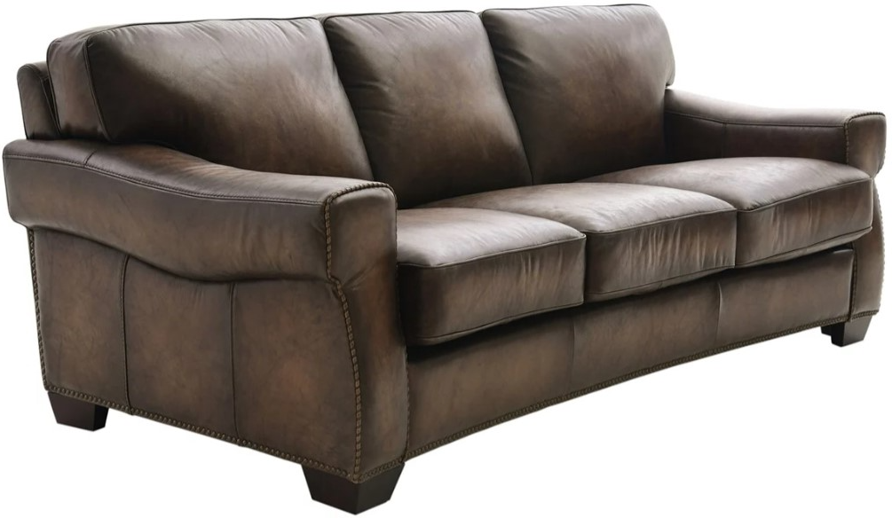 Upholstered in a hazelnut brown top-grain leather where body contact occurs and split leather on the sides and back, this slightly curved sofa features plump back and seat cushions, padded key arms, stitched accents, tailored base, and tapered block feet in a dark brown finish.Read More