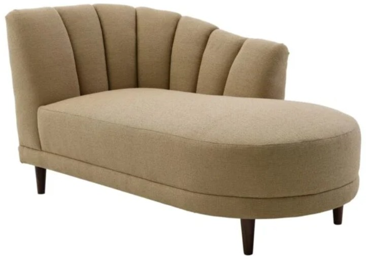 The Andrea chaise, shown in upholstered tan woven fabric, features a padded channeled back and side, plush cushion, tailored base, and dark brown tapered feet for a refined, comfortable look.Read More